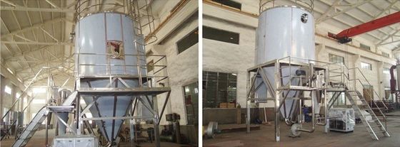 De lucht door de verwarmer in de hete lucht in het centrifugaalapparaat van de nevel drogende machine, in de drogende kamer bij de bovenkant van de hete luchtverdeler, en dan gelijk in de drogende kamer, en spiraalsgewijs bewegende rotatie, tegelijkertijd zal naar het apparaat van materiële vloeibare centrifugaalverstuiver bij de bovenkant van een drogende kamer worden verzonden, de materiële vloeistof in uiterst kleine mistdruppeltjes bespuiten, contact met hete lucht opnemen en de stroom van materiële vloeistof, vochtigheid verdampt snel.
